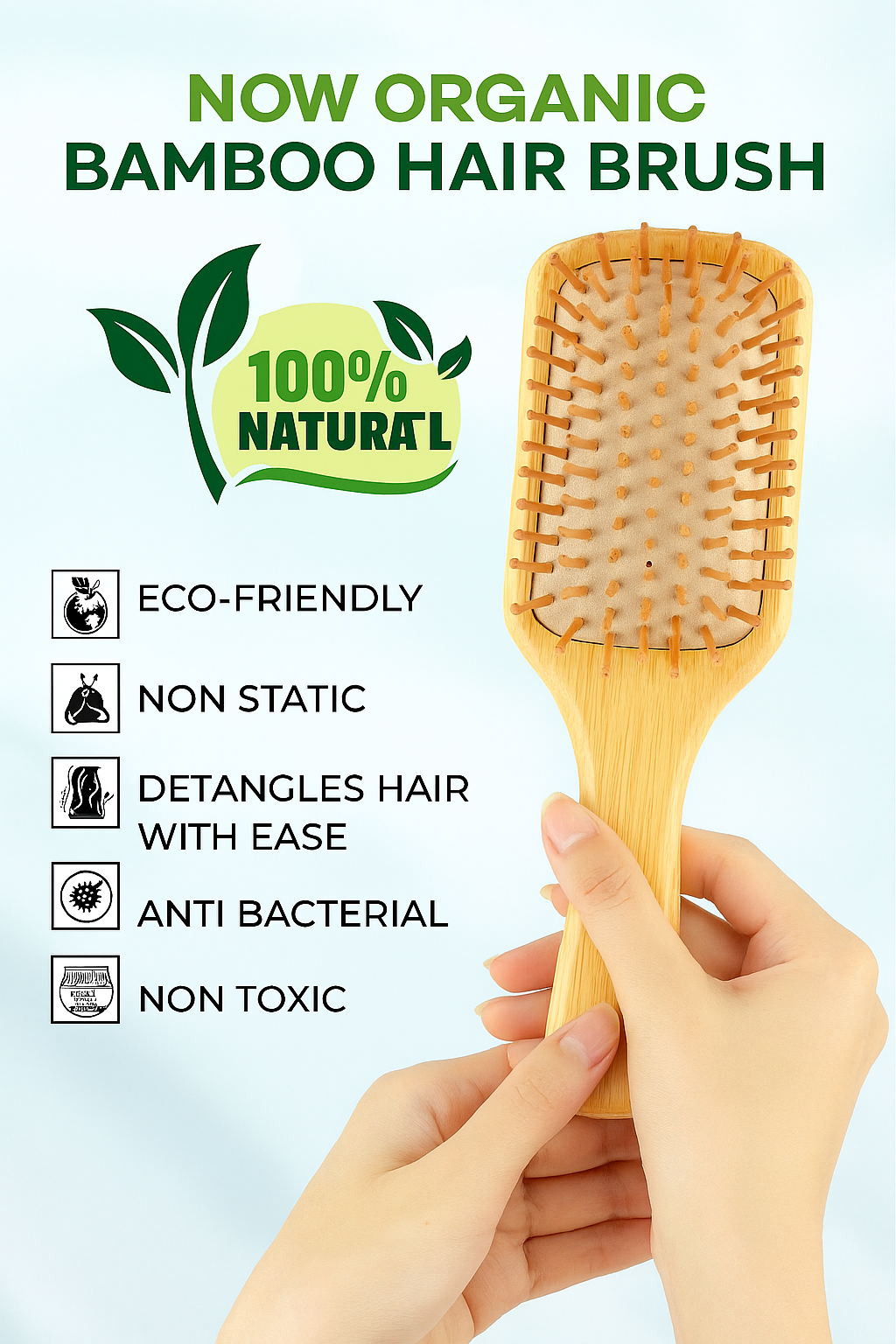 🌿 Eco-Friendly Bamboo Paddle Hair Brush – Gentle Detangling & Scalp Massage
